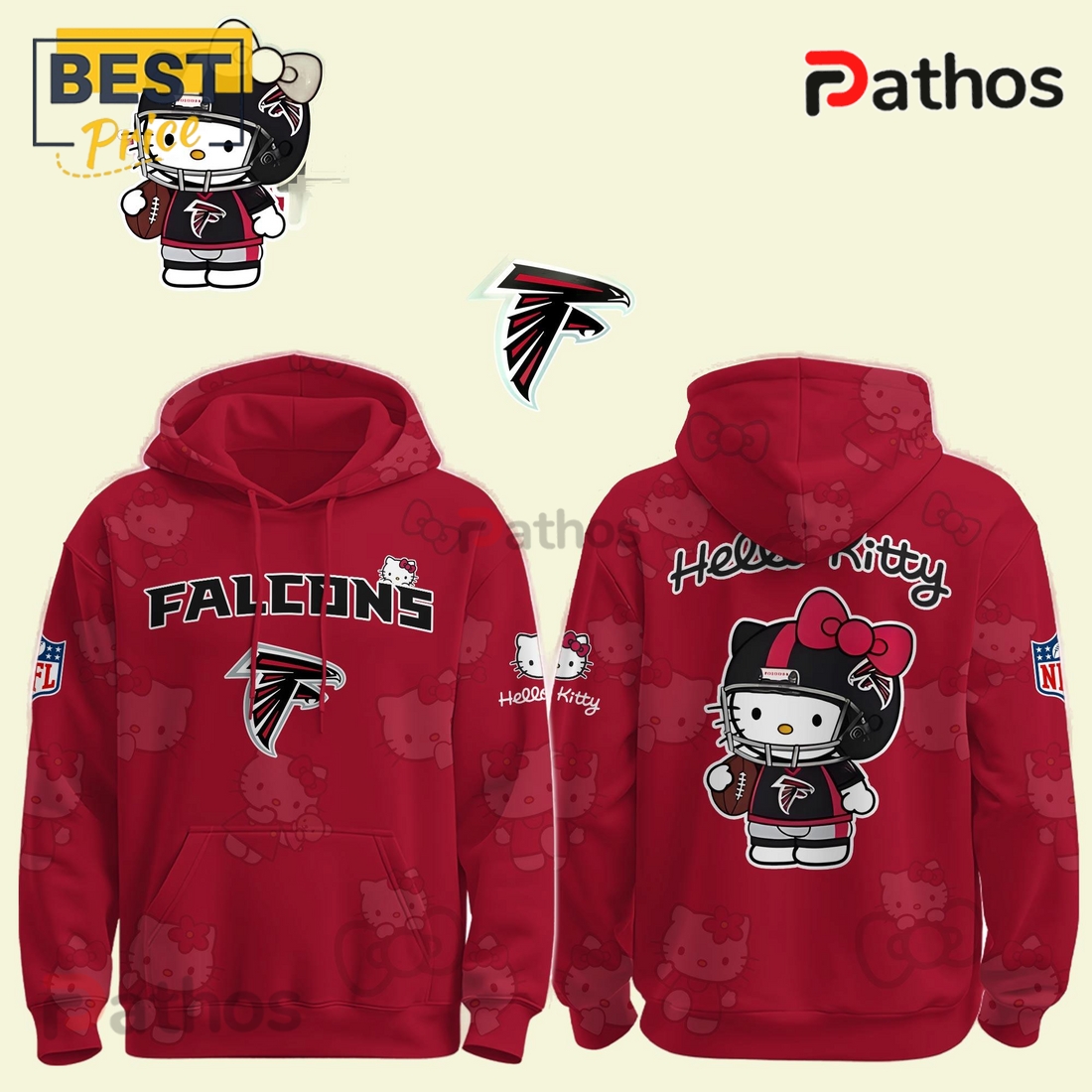 The visual design is where this hoodie truly shines, showcasing a clever and harmonious integration of two distinct brands. The central graphic is a true masterpiece of crossover appeal, typically featuring Hello Kitty herself, not merely alongside the Falcons logo, but actively embracing the team’s identity. She might be depicted playfully sporting a miniature Falcons helmet, perhaps holding a football adorned with the team’s insignia, or even wearing a scaled-down team jersey, her signature bow elegantly re-imagined in the team’s iconic red and black hues. The legendary Falcons logo, whether it’s the classic falcon head or a more stylized version, is seamlessly incorporated into the design, often serving as a backdrop or an integral element of Hello Kitty’s ensemble. The color palette itself is a thoughtful blend, utilizing the bold red, black, and white associated with the Falcons, punctuated by Hello Kitty’s signature white and the occasional subtle pink accent, ensuring the hoodie remains vibrant, eye-catching, and unmistakably tied to both franchises. This meticulous attention to design ensures the product feels cohesive and intentional, appealing to fans of both worlds without one overshadowing the other.