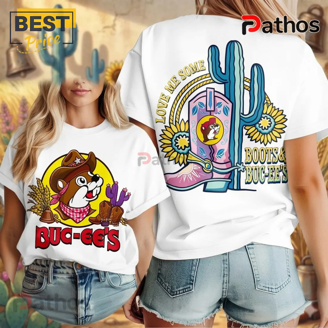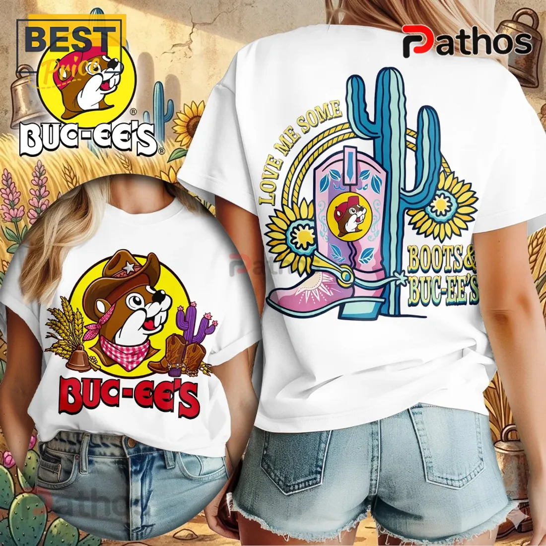 Buc-ee’s character, adorned in a cowboy hat and bandana, anchors the front design with a delightful, quirky charm. Its expressive features and friendly demeanor are key to the graphic’s endearing appeal.