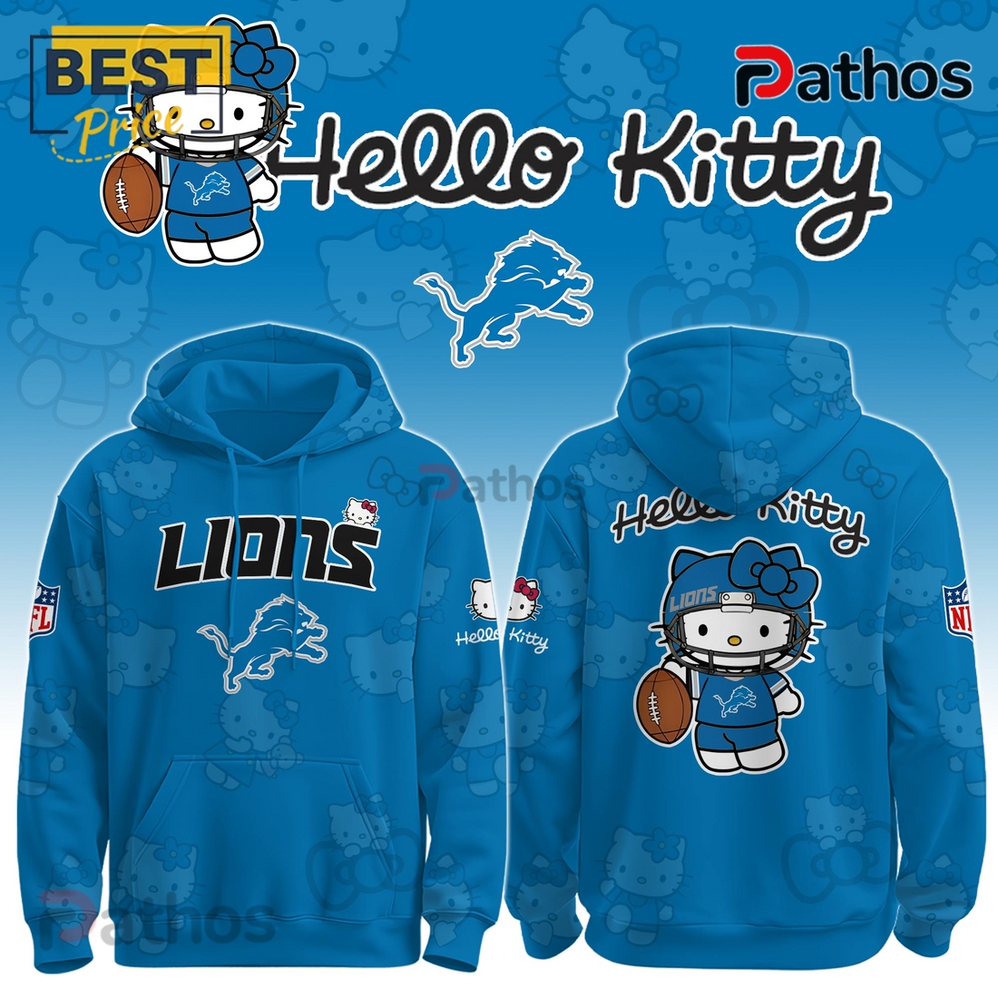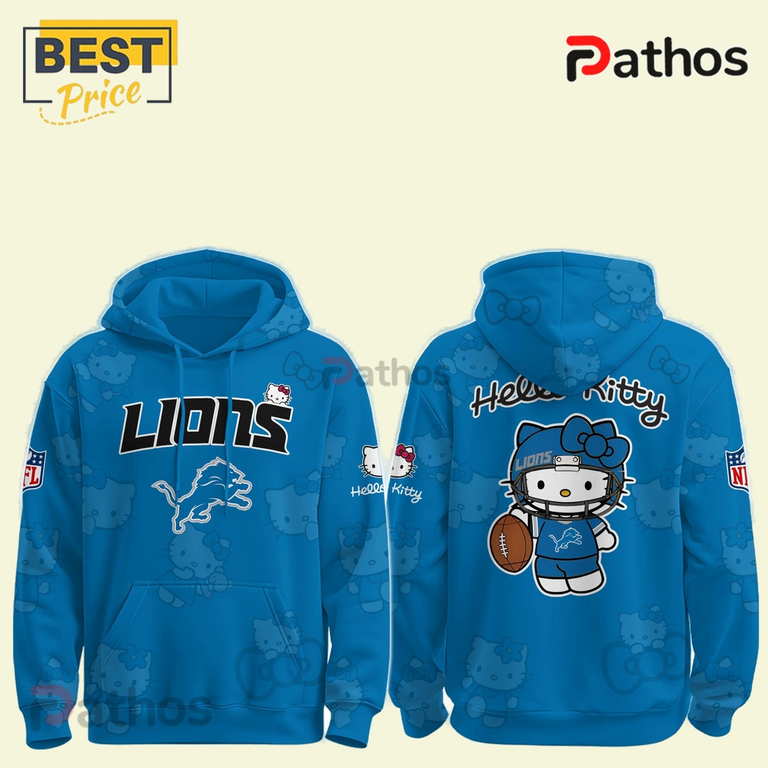 Visually, the hoodie is a striking symphony of the Detroit Lions’ iconic Honolulu Blue and silver, artfully integrated with Hello Kitty’s recognizable aesthetic. The central design often features Hello Kitty herself, reimagined in a Lions-themed ensemble—perhaps sporting a miniature Lions helmet, holding a football adorned with the team’s logo, or playfully interacting with the classic roaring lion emblem. Her signature red bow might be subtly tweaked to match the team’s colors, or stand out as a vibrant pop against the blue backdrop. The Lions’ official logo and wordmark are typically incorporated with precision, ensuring authentic team representation. This isn’t a mere sticker; the graphics are high-quality screen prints or intricate embroidery, designed to withstand numerous washes without cracking, fading, or peeling, preserving the hoodie’s vibrant appeal for years to come.