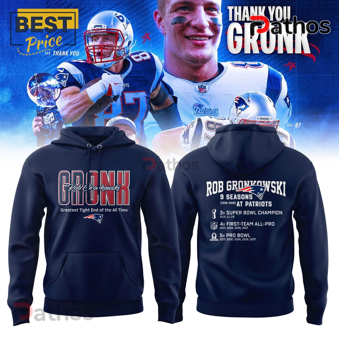 The New England Patriots Thank You Rob Gronkowski 2025 Hoodie and Pants ensemble represents far more than mere fan apparel; it is a meticulously designed tribute, a wearable piece of history celebrating one of the franchise’s most iconic figures. This premium two-piece set is anticipated for release in 2025, specifically designed to commemorate a significant future anniversary of Gronkowski’s legendary career or a future milestone marking his enduring legacy with the team, making it an instant collector’s item and a profound statement of appreciation. The set immediately captures attention with its striking blend of classic Patriots colors—deep navy blue, vibrant red, crisp white, and subtle silver accents—all applied with precision to honor the team’s storied aesthetic. Prominently emblazoned across the chest of the hoodie and subtly integrated into the design of the pants is the heartfelt “Thank You Rob Gronkowski” message, often accompanied by his iconic number 87, rendered in a bold, commemorative font that ensures its emotional impact. The “2025” detail isn’t just a year; it signifies a designated moment for reflection and gratitude, enhancing the garment’s exclusivity and its place as a future heirloom for dedicated fans.