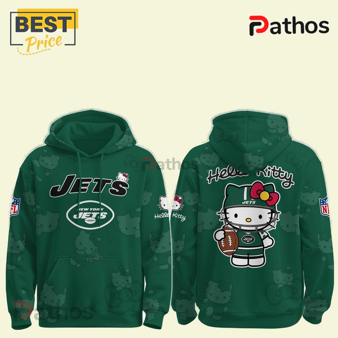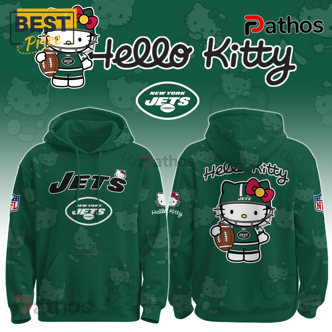 Visually, the hoodie stands out with its meticulously applied graphics. The iconic New York Jets logo, often presented in its bold Gotham Green and white, is cleverly integrated with Hello Kitty herself. You might find Hello Kitty cheerfully sporting a miniature Jets helmet, holding a football adorned with the team emblem, or even subtly incorporated into the logo design, giving a fresh, unexpected twist to traditional team apparel. The exact placement and style of these combined graphics are executed with precision, often showcased prominently across the chest, sometimes with additional smaller details on the sleeve or hood. The primary color palette generally adheres to the Jets’ official hues, primarily dark green, white, and black, making it instantly recognizable as team gear, yet the Hello Kitty element introduces a delightful splash of her signature red bow or pink accents, adding a vibrant, contrasting pop. This thoughtful design ensures that the collaboration feels cohesive and purposeful, rather than just two disparate logos slapped together.