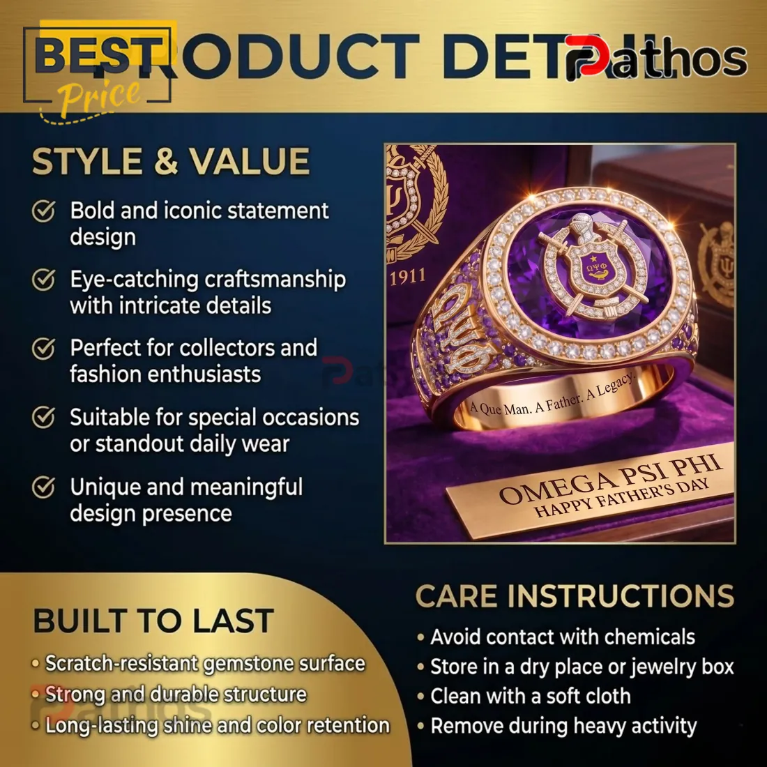 More than just an accessory, the Omega Psi Phi Que Man Father’s Day Luxury Gold Purple Diamond Crest Ring is a powerful symbol of honor, strength, and dedication. Forged from premium stainless steel, it’s engineered to endure – a lasting tribute to the noble spirit of service.