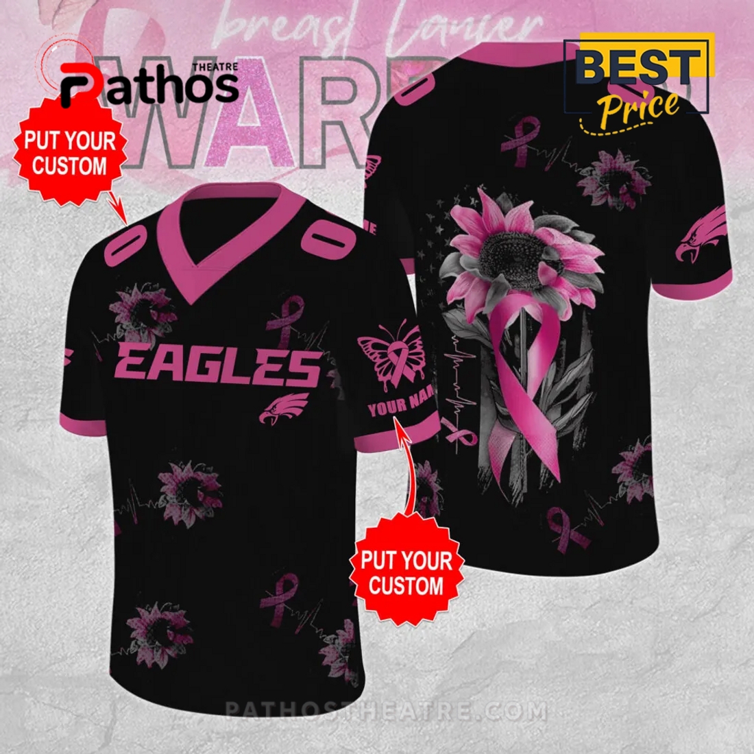 This Philadelphia Eagles x Breast Cancer Awareness football jersey offers a unique opportunity to combine your unwavering Eagles fandom with your support for a vital cause. The jersey replicates the team’s authentic design, featuring the iconic Eagles logo prominently displayed across the chest, along with player numbers and names (depending on the specific jersey purchased) in the familiar team colors of midnight green and silver. However, what sets this jersey apart is its incorporation of elements specifically designed for Breast Cancer Awareness month. This includes a subtle yet impactful pink ribbon emblem, typically integrated seamlessly into the design—perhaps embroidered on the sleeve or subtly woven into the fabric—serving as a clear visual representation of your commitment to the fight against breast cancer. The fabric itself is likely a high-quality, breathable material, ensuring comfort during extended wear, whether you’re cheering at the stadium or simply wearing it around town. This attention to comfort is essential, given that the jersey is designed for both functionality and representational purposes. The fit is typically athletic and tailored for a comfortable, yet not overly restrictive, feel, allowing for easy movement. Beyond the aesthetics, purchasing this jersey offers a tangible way to contribute to the fight against breast cancer. A portion of the proceeds from every sale is often donated to a designated breast cancer research organization or charity, allowing you to directly support initiatives focused on prevention, research, treatment, and patient support. This makes the jersey a meaningful purchase for individuals passionate about the Eagles and those dedicated to supporting a worthy cause. The quality of construction is generally high, promising longevity and ensuring that this piece will be a cherished addition to your wardrobe for years to come. Therefore, this jersey provides a blend of stylish team spirit, charitable contribution, and high-quality construction, making it an attractive option for Eagles fans who want to make a statement about their team and their commitment to breast cancer awareness. This makes it more than just apparel; it’s a symbol of support, a testament to your team spirit, and a valuable contribution to a significant cause.